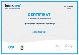 Na Akademiji Interzero boste našli namenske spletne seminarje o ravnanju z odpadki, razširjeni odgovornosti proizvajalca (PRO) za odpadno embalažo, električno in elektronsko opremo in odpadne baterije, optimizaciji odpadkov v podjetju, pripravi na obisk okoljskega inšpektorja, “SUP Uredbi” in drugih okoljskih vprašanjih! Z dostopom do platforme boste pridobili konkretno znanje in praktične nasvete o tem, kako se soočiti s hitro spreminjajočo se zakonodajo izbrane teme.